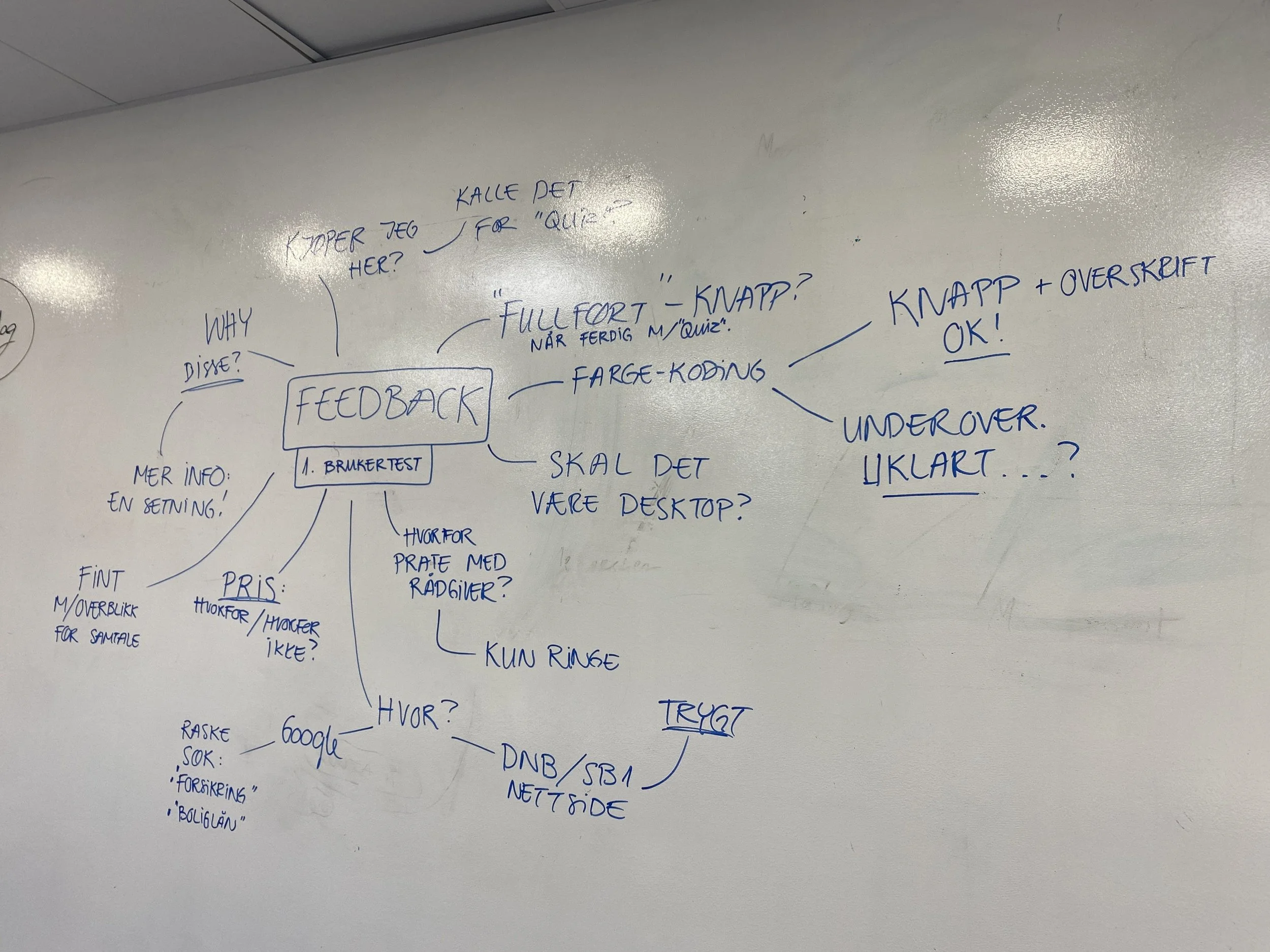 Oppgaven vi fikk var veldig åpen, hvor vi kunne være kreative og velge fritt hva løsningen skulle inneholde. Dette førte også til mye tid brukt på innsiktsarbeid. For å snevre inn oppgaven måtte vi kartlegge behovet til brukerne. Vi har hatt mye brainstorming med blant annet Crazy 8's, mange intervju runder med målgruppen, vært med på Medlytt (lyttet til rådgiversamtaler), flere samtaler på huset, og lest gjennom tidligere rapporter på emnet. Vi har brukt triple diamond som metode, samt OKRs for å definere mål.